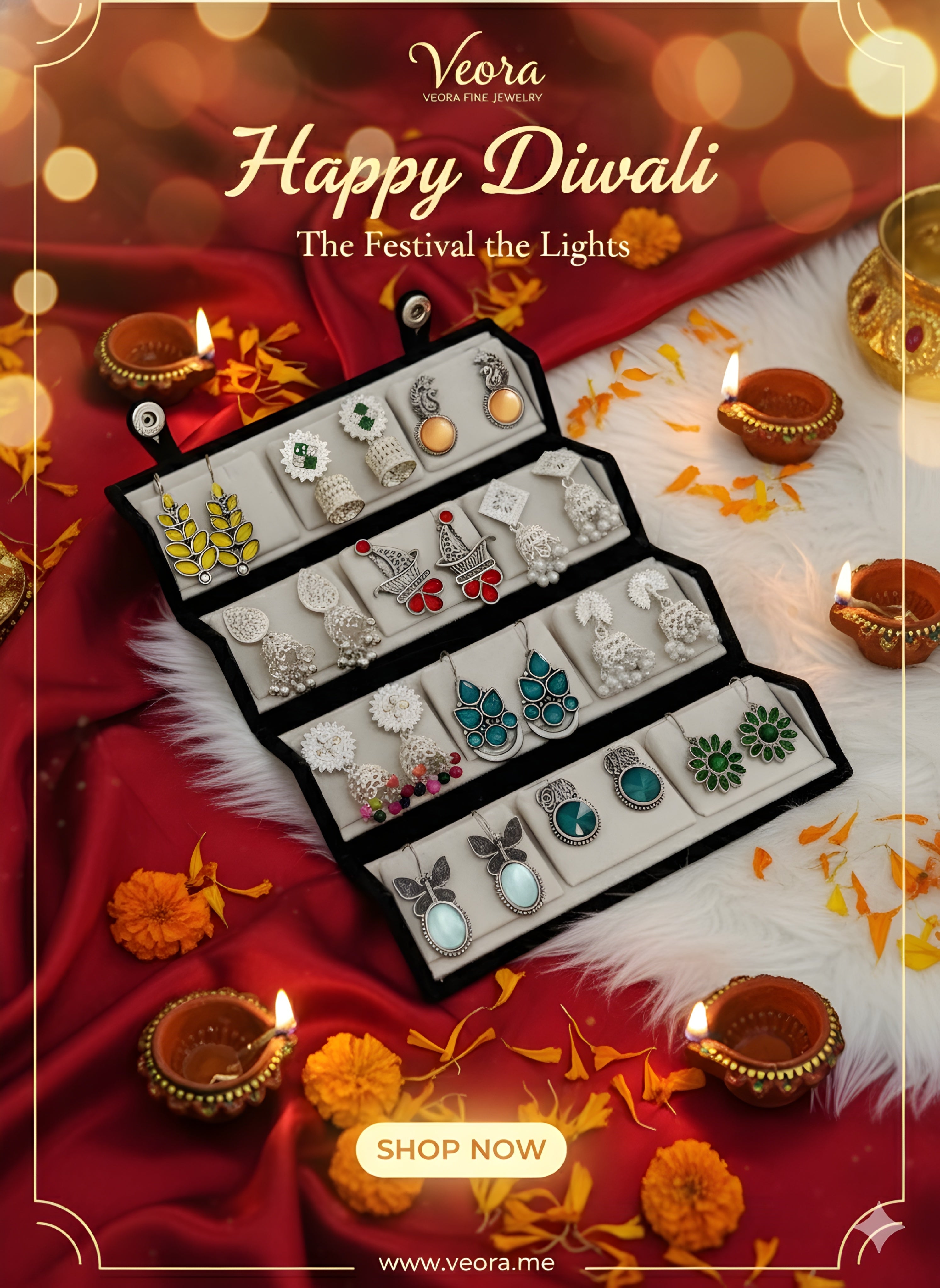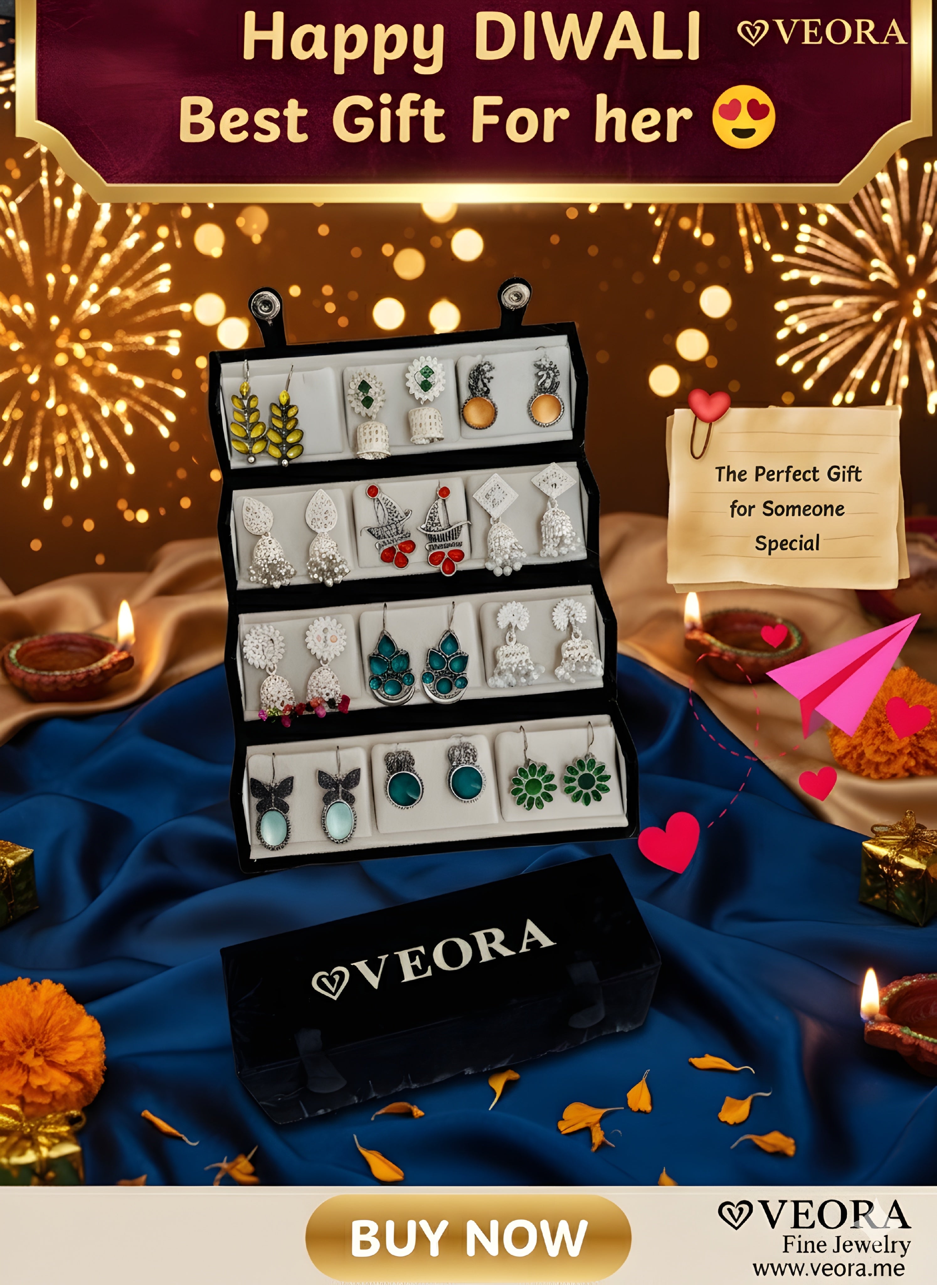 Set Of 12 Oxidized Designer Stud Earrings With Folding Jewelry Box